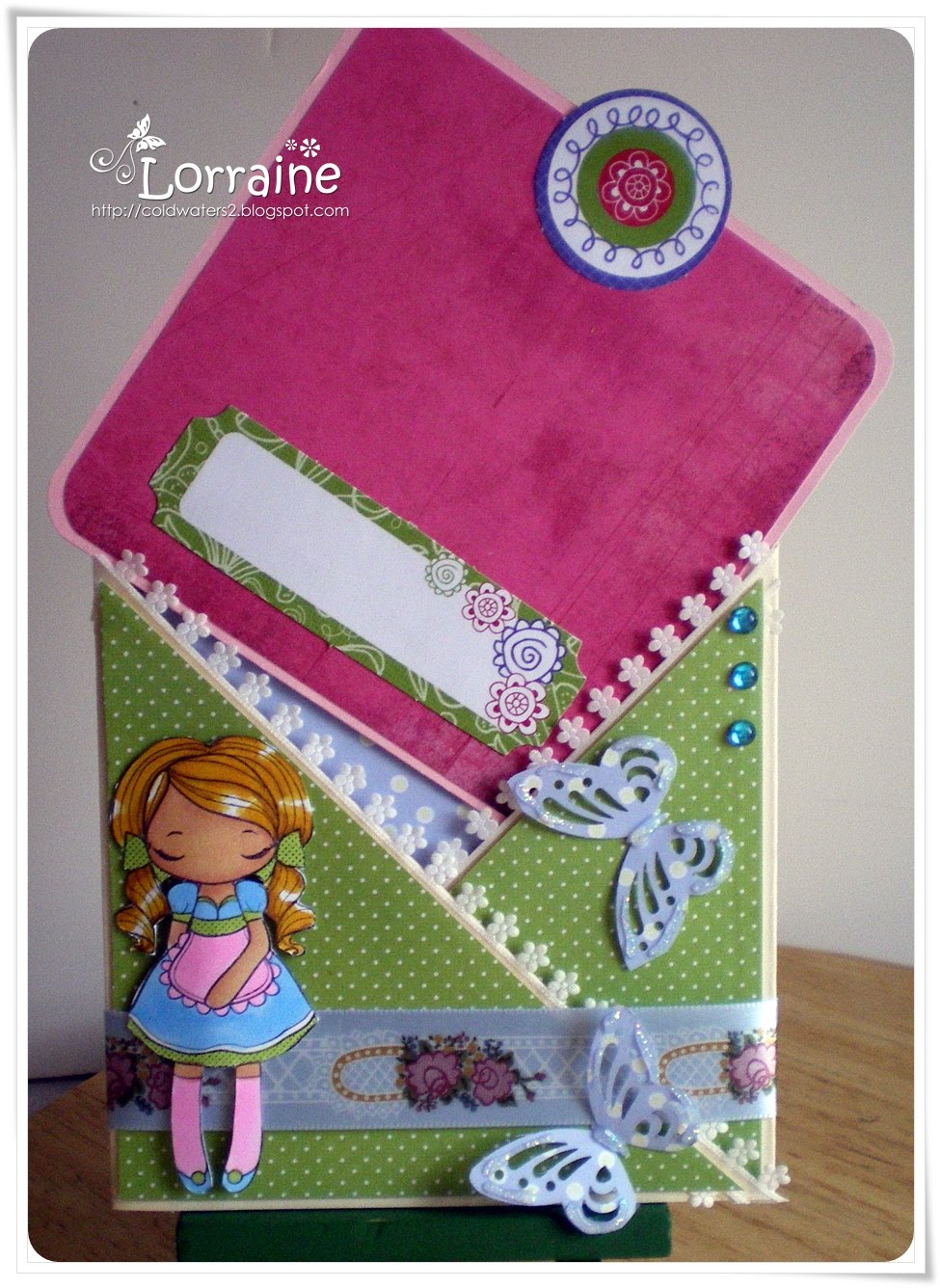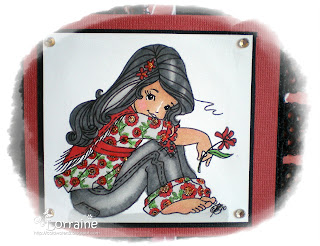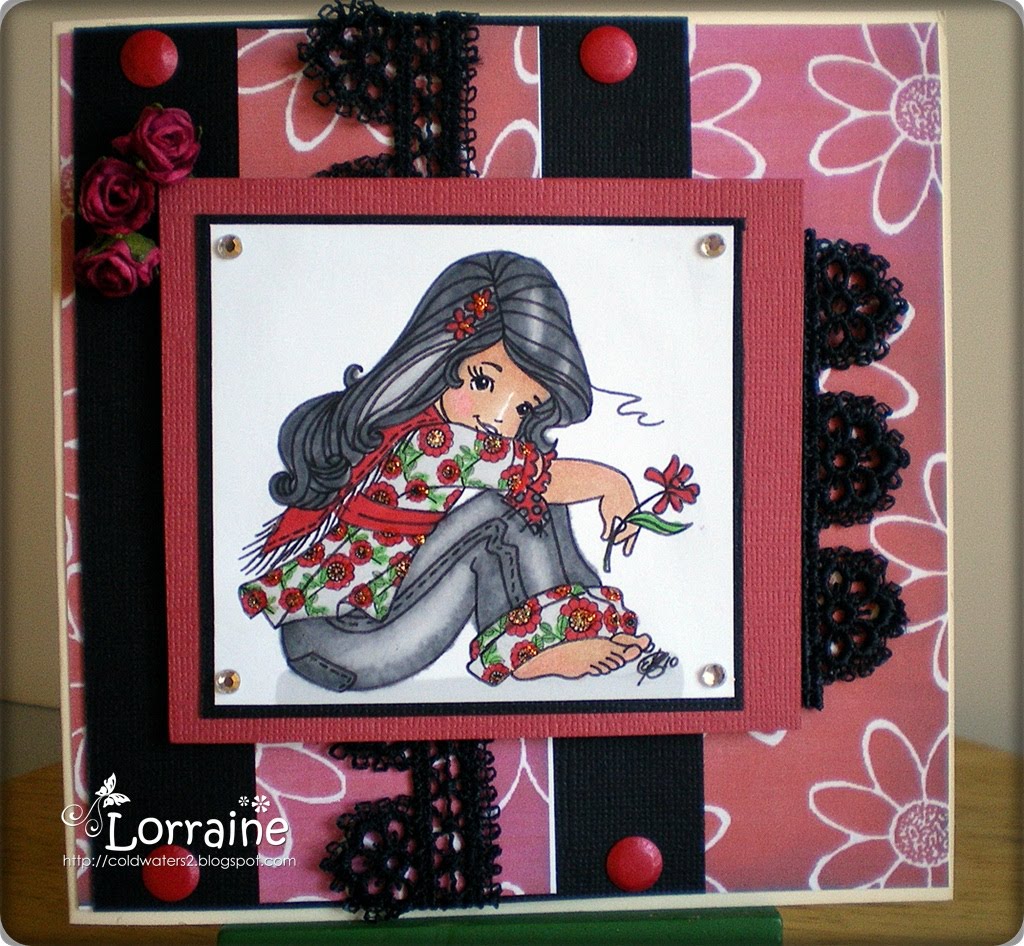 The image I coloured with promarkers and added some diamond stickles to the little flowers on her tunic. The bp I printed off my computer ages ago so cannot say a name at this time, I have used co-ordinations black card, red card candy and black lace from the Lawrence Bowen range, I also added a few red roses and gems.