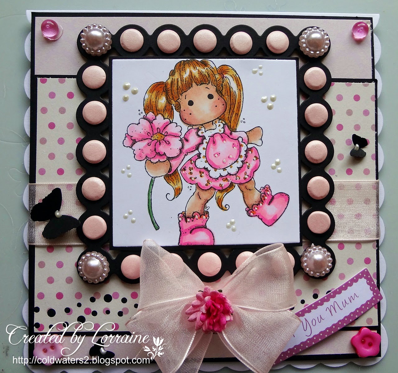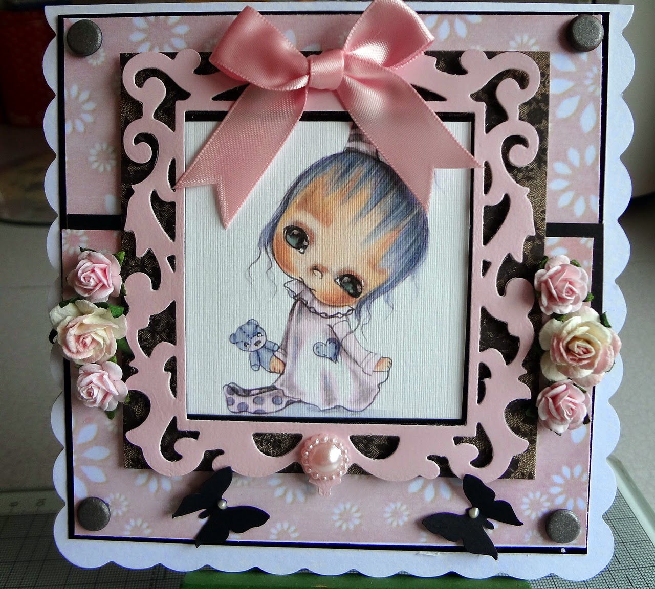 I used Momento Tuxedo ink then coloured her with a mixture of Graph It Markers and Copics, I used a square Spellbinders frame in black to show her up then added pink card candy and pink flower pearls, I also added some cream Viva Decor pearl drops, pink gems, pink organza ribbon and bow, pink buttons, pink flower, pink sentiment and some punched butterflies in black with cream Viva Decor pearl drops.