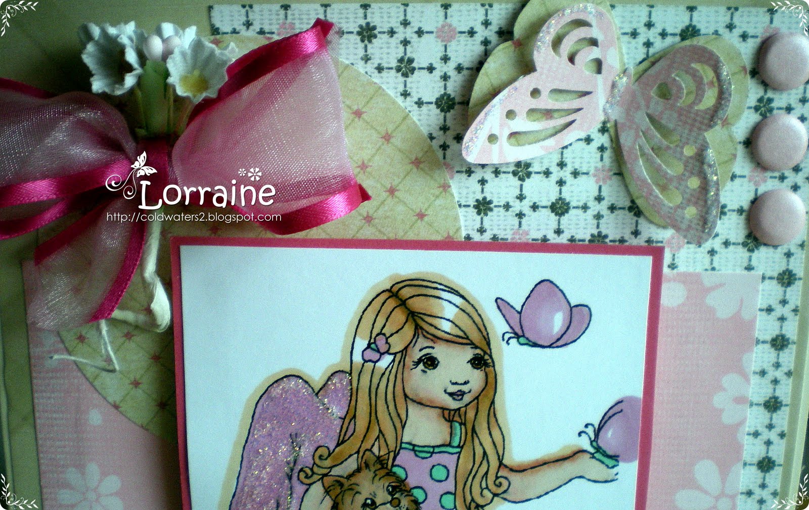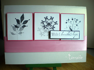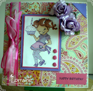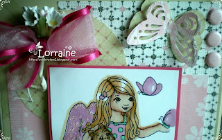 I have used an A5 tapestry embossed black card base which is why I have not used any dp it is virtually impossible to see in the picture but in real life it is rather beautiful. I have used a Chi Chi image which is one of my favourites called 'relax' I have kept colouring to a minimum and used lilac and greys, the image I mounted onto lilac card. I added some matching card candy and flowers from my stash the ribbon is a new satin patterned designer ribbon which also has a very slight lilac tinge to it.