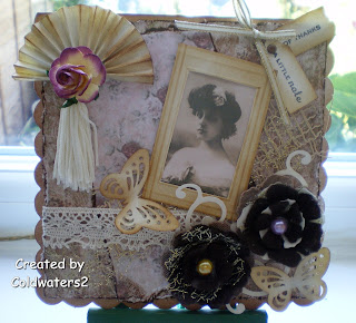I decided to go Vintage and used a 6x6 white card base which I distressed with TH Vintage Photo Distress ink, the papers I have used are from Bearlymine Vintage set available HERE. The image is from Graphic Fairy, I used my Hougie board to make a small frame which I distressed with Vintage Photo ink and mounted onto foam pads, the flowers I made using TH Tattered Floral Die and various materials including brown felt. I punched some swirls and butterflies from cream card then distressed the Butterflies, once again using Vintage Photo ink. I added some lace and used pearls for the centre of the flowers. I created a half fan from cream card and distressed the edges with.....yes you guessed it, TH Vintage Photo ink I added a tassel and rose, the tags were punched from my Fiskers tag punch threaded a ribbon stamped a sentiment and distressed the edges.