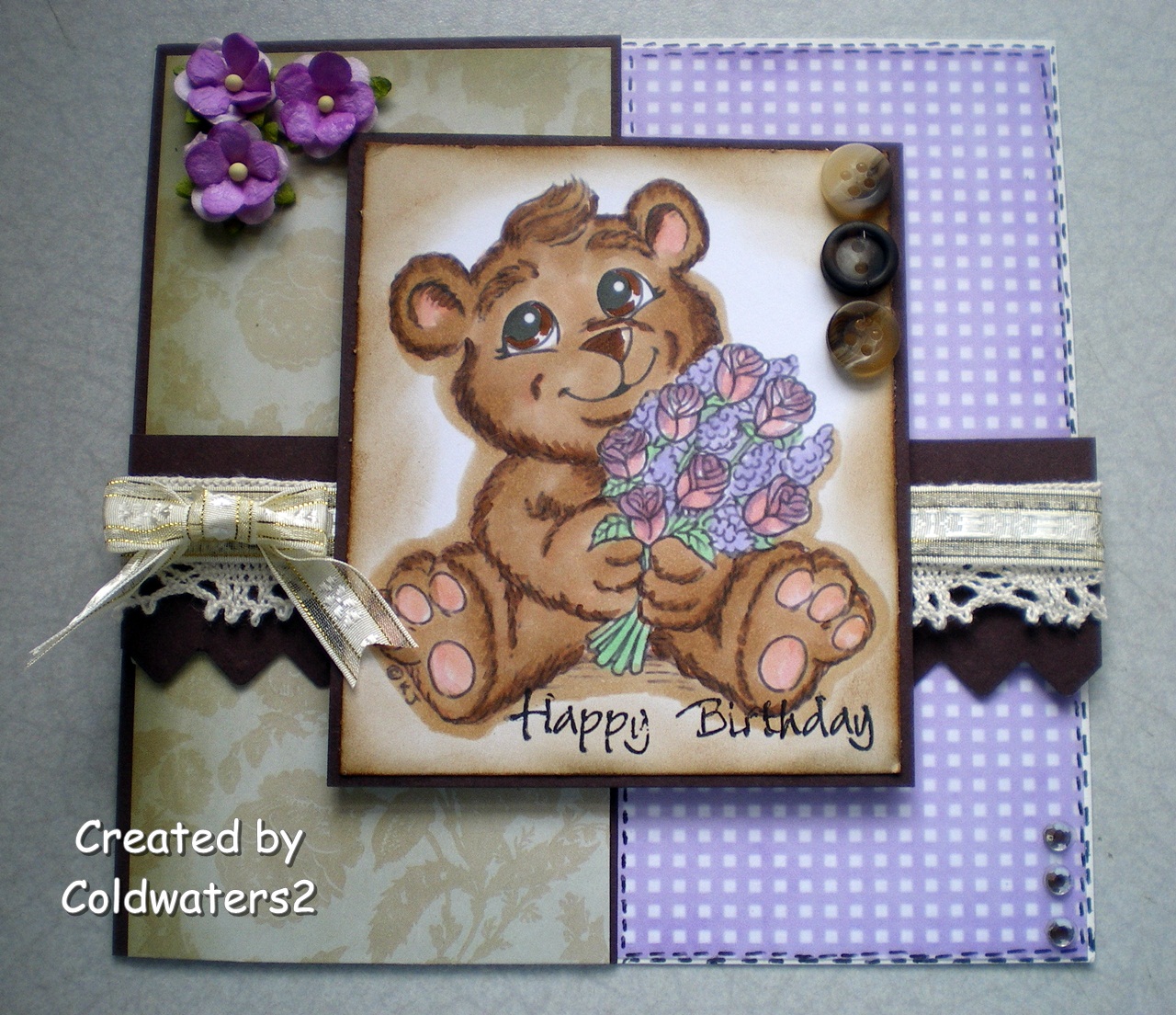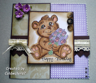 For my card i have used an image from Karens Doodles and coloured with Copics, I distressed the edges of the image with TH Vintage Photo ink, the papers are Bearlymine and Papermania Luxury Collection, I have mounted the image onto SU Choc Chip card, the central band is also Choc Chip and has been punched using an EK Success punch, I added some lace, ribbon, bow, gems, buttons and flowers, I have added faux stitching to the right side of the card.