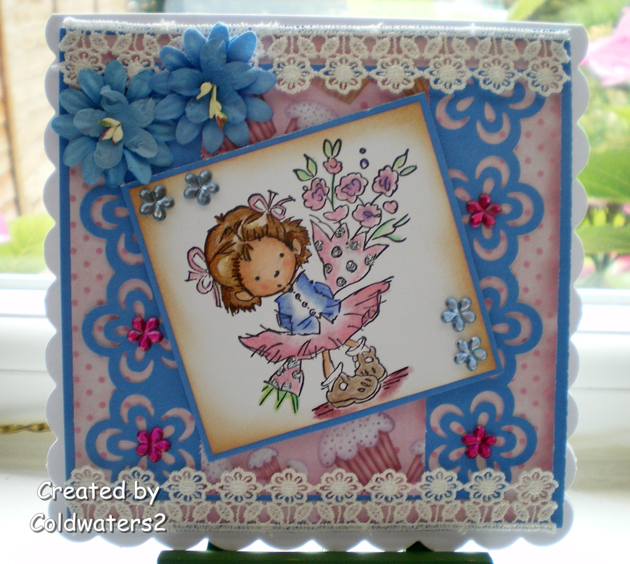 I decided to use one of my new rubber LOTV images which I have only used once before.  I have coloured her with Copics, distressed around the edge with TH Vintage Photo ink and added some flower gems, the papers are from Bearlymine Extreme Vol 1, I used my EK Success Flower border punch and added some pink gems, I also adhered some flower lace and flowers.