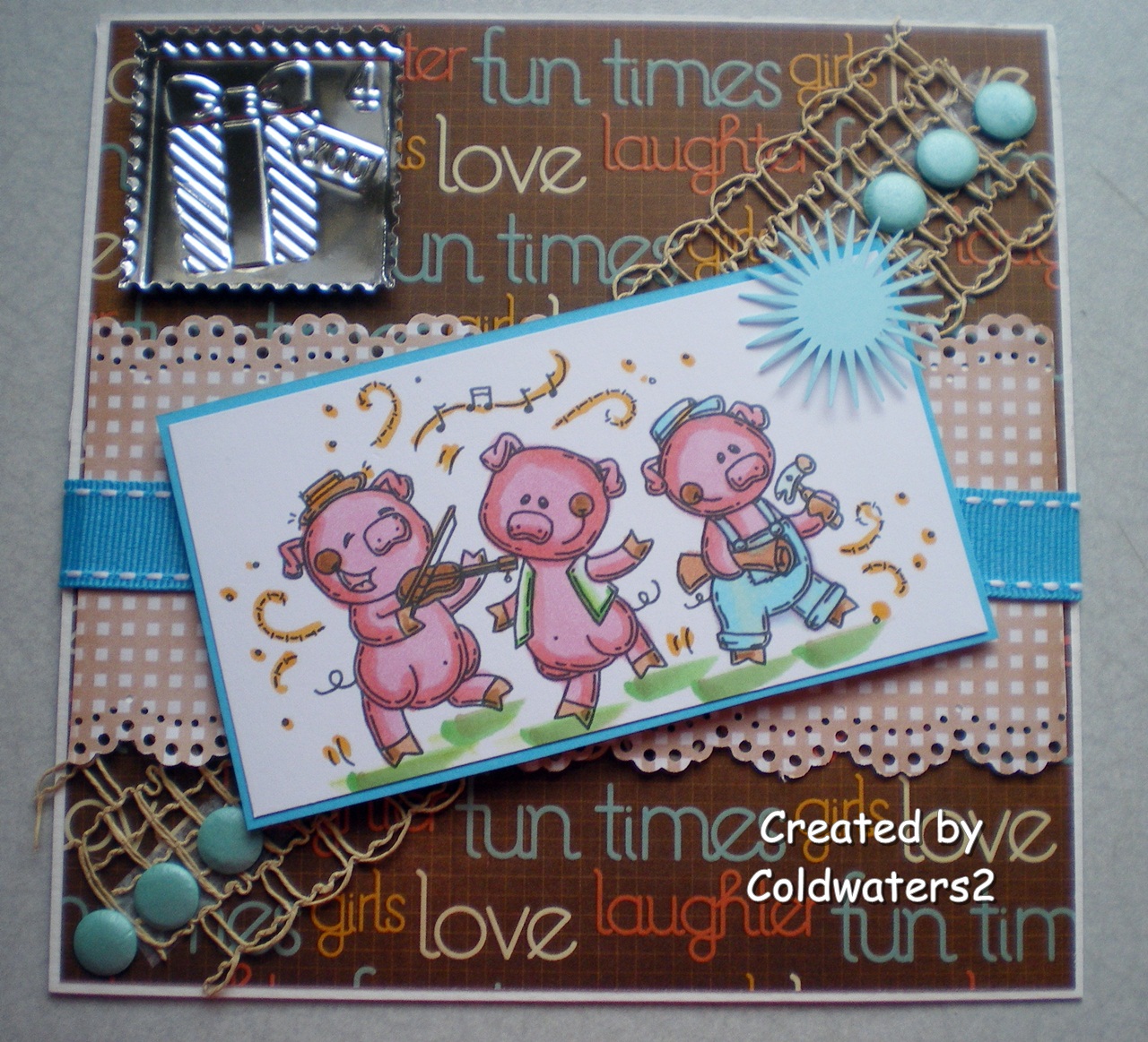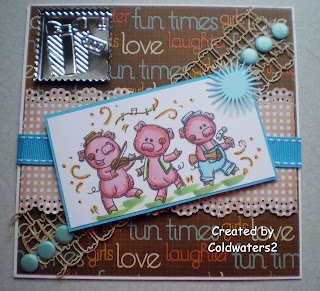 I have used an image from Whimsy called Three Little Piggies, I have coloured them with Copics, the base papers are embossed and from Kaiser, the gingham is from Bearlymine.  I have added raffia ribbon, blue stitched ribbon, card candy and an embossed sentiment.