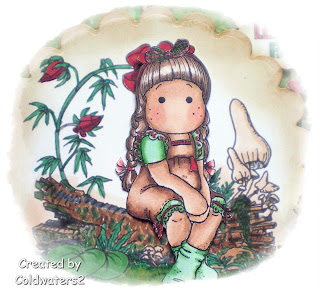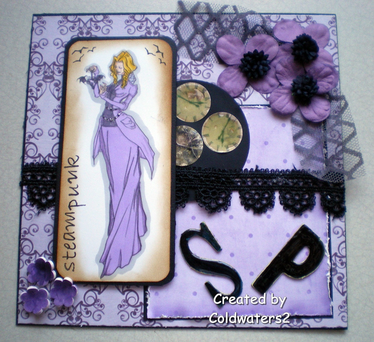 My third and final card is a sort of version of Steam Punk, I have used an image from Simply Betty and coloured her with Promarkers, I added black lace, black/grey vintage lace and flowers. The 3 little flowers at the bottom are made with shrink plastic, the 3 watch faces I cut out from some bp and embossed them with thick clear powder, I found some chipboard letters coloured them with a black promarker then added Glossy Accents, I used TH Vintage Photo distress ink around the image then used my individual alphabet cute tip stamps for the wording.