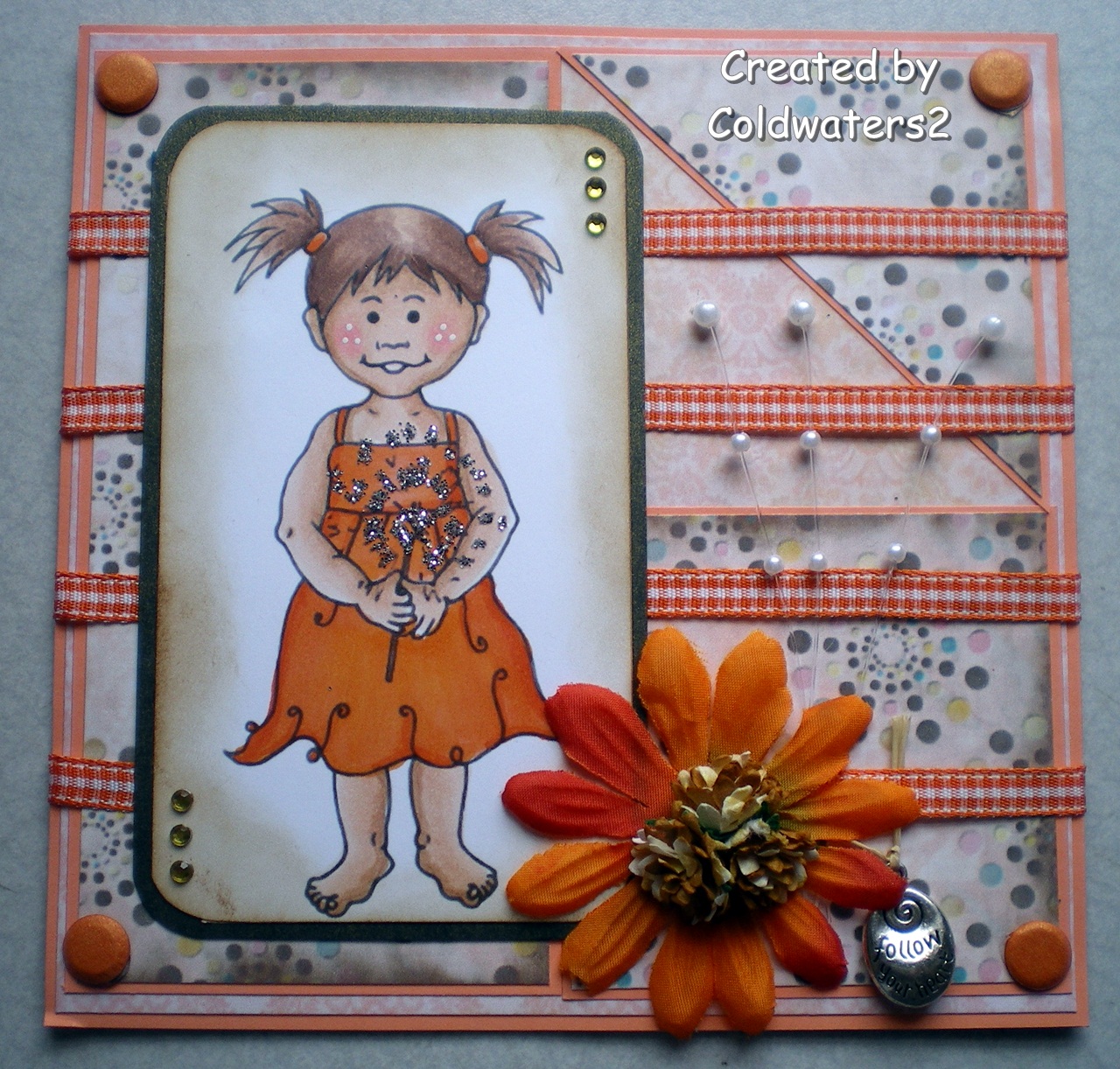 I have used the Cute Lion image from Kenny K and coloured her with Copics, I actually printed her out on golden parchment paper, I stamped my 'sand' stamp around the edges then mounted her onto gold mirri card. The papers are Basic Grey Hopscotch, I added a strip of gold mirri card across the centre topped with raffia ribbon and gold ribbon, I added some card candy, flowers, butterfly and sentiment.